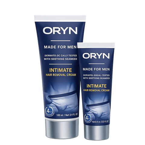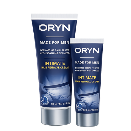 ORYN uses our Smooth-Release™ system to gently dissolve the bonds that hold hair to your skin. Instead of cutting hair like a razor, it releases it so it wipes away clean. This means smoother skin for longer, fewer ingrowns, and no irritation — all in just 3–4 minutes. Designed specifically for men’s sensitive areas.